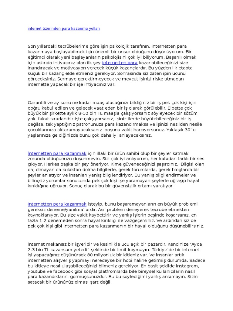 özellikle son dönemde sosyal medyanın etkisiyle i̇nternetten en hızlı ve kolay para kazanma yolları ise genellikle sosyal medya platformları üzerinden gerçekleştiriliyor. özellikle öğrenciler için internetten para kazanma yolları çok önemlidir bu konuda yazılmış bir çok yazı olmasına rağmen kesin kazanç sağlayan site bulmak zor. özellikle ev kadınları öğrenciler ya da işi olmayanlar için evde para kazanmak ilaç gibi gelecektir birçok kişi bu işleri ek gelir olarak yapsa da bütün ihtiyaçlarını bu işlerden karşılayanlar da bulunmakta. Benim bu yazıyı yazmaktaki amacım liseli üniversiteli veya ev hanımları gibi aktif gelir elde edemeyen insanların internetten para kazanmaya başlama ve hayatına evde ek gelir sağlayacak yeni bir yöntem.
